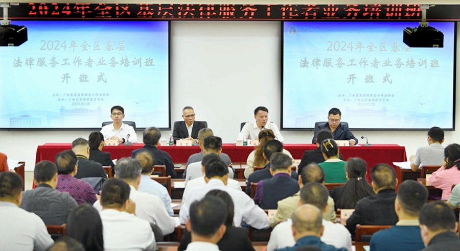 10月28日,2024年全区基层法律服务工作者业务培训班在我院开班。广西基层法律服务工作者协会会长苏黎、自治区司法厅律师工作处副处长、广西基层法律服务工作者协会秘书长陈童出席开班式,我院院长闭富春出席开班式并致辞。