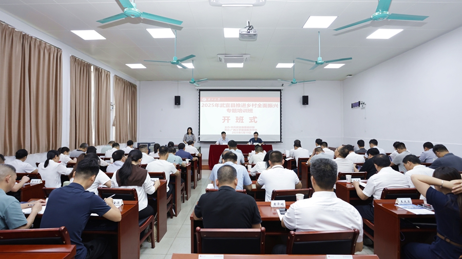 5月19日,2025年武宣县推进乡村全面振兴专题培训班在我院开班。武宣县财政局党组成员、纪检监察组组长郭黄强出席开班式并作动员讲话,我院干部培训中心副主任李文出席开班式并致辞。